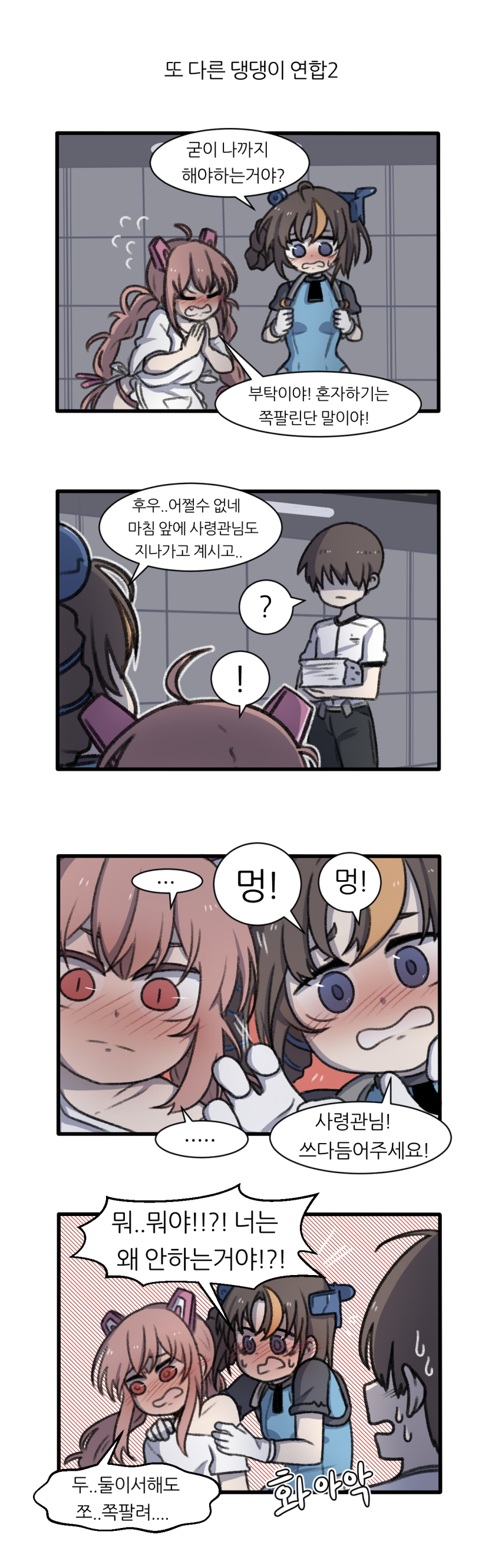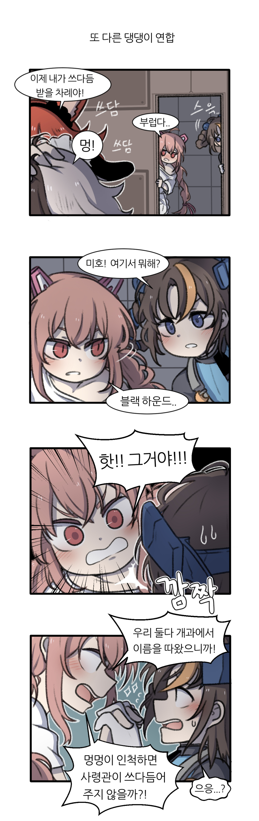 feel자 님이 그린 댕댕이 연합 만화! 이번 댕댕이 연합은 지난번 '댕댕이 연합 긴급회의(링크)' 만화 마지막과 이어지는 내용이다. 미호 녀석 많이 아쉬워하더니 결국 블랙 하운드를 꼬드겨서.... 부끄러움을 무릅쓰고 미호를 도와주는 블하 너무 착해!