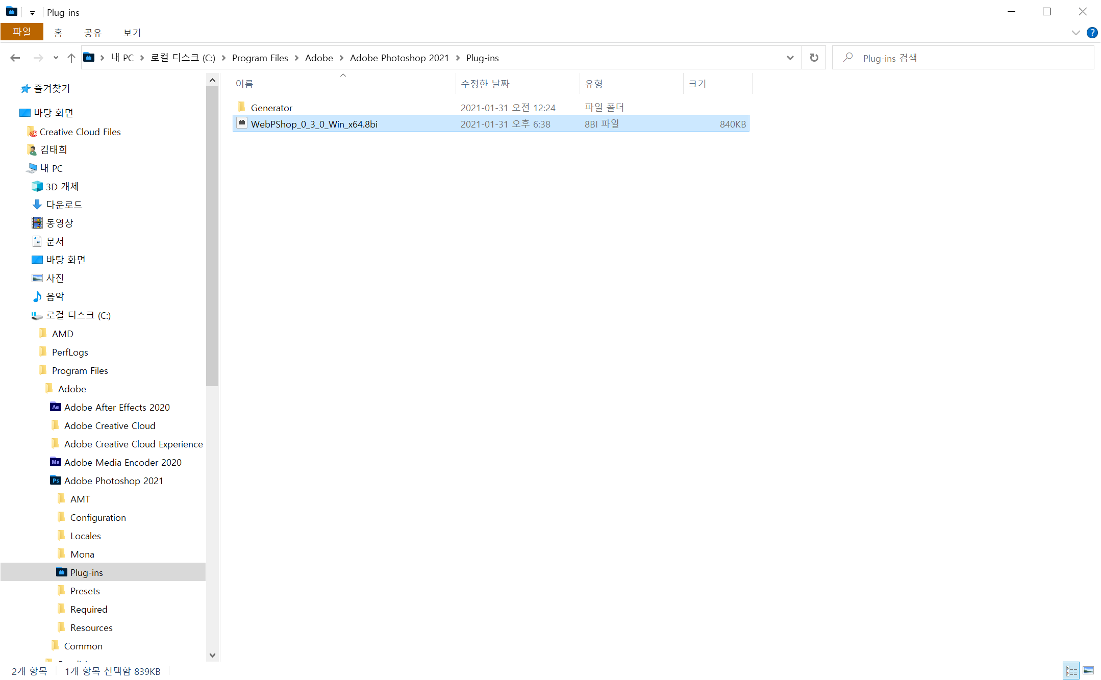 2. 포토샵이 설치된 폴더\Plug-ins 폴더(C:\Program Files\Adobe\Adobe Photoshop 2021\Plug-ins)에 앞서 다운로드한 플러그인을 붙여 넣는다.